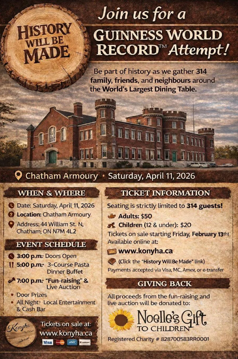 A uniquely local, record-setting, and purpose-driven experience is coming to Chatham-Kent this spring. On Saturday, April 11, the community is invited to take part in History Will Be Made a celebration of agriculture, sustainability, community spirit, and generosity—as 314 guests gather around what is anticipated to be the World’s Largest Dining Table, set inside the historic Chatham Armouries.